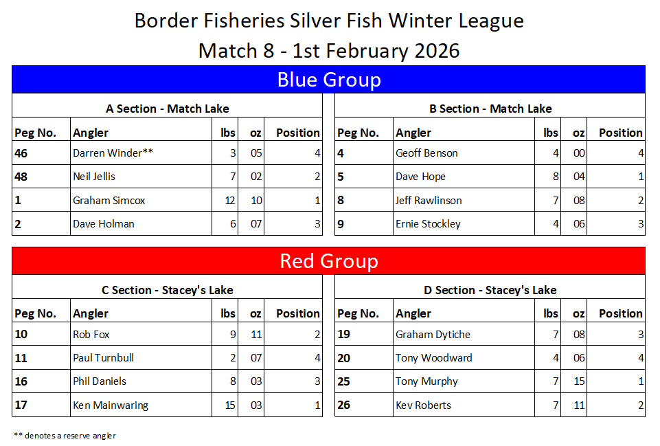 Winter league 2025/26 – Match 8 of 10 – 1st February 2026 Border Winter League Points Table 2025-26 After Match 8 Border Winter League Weights Table 2025-26 After Match 8 Border Winter League Pairs Table 2025-26 After Match 8 Border Winter League Speci Lake Weights Table 2025-26 Border Winter League Match Lake Weights Table 2025-26 Border Winter League Staceys Weights Table 2025-26 NeilJ-admin2026-02-01T19:07:14+00:00 Share this page FacebookXRedditLinkedInWhatsAppPinterestEmail